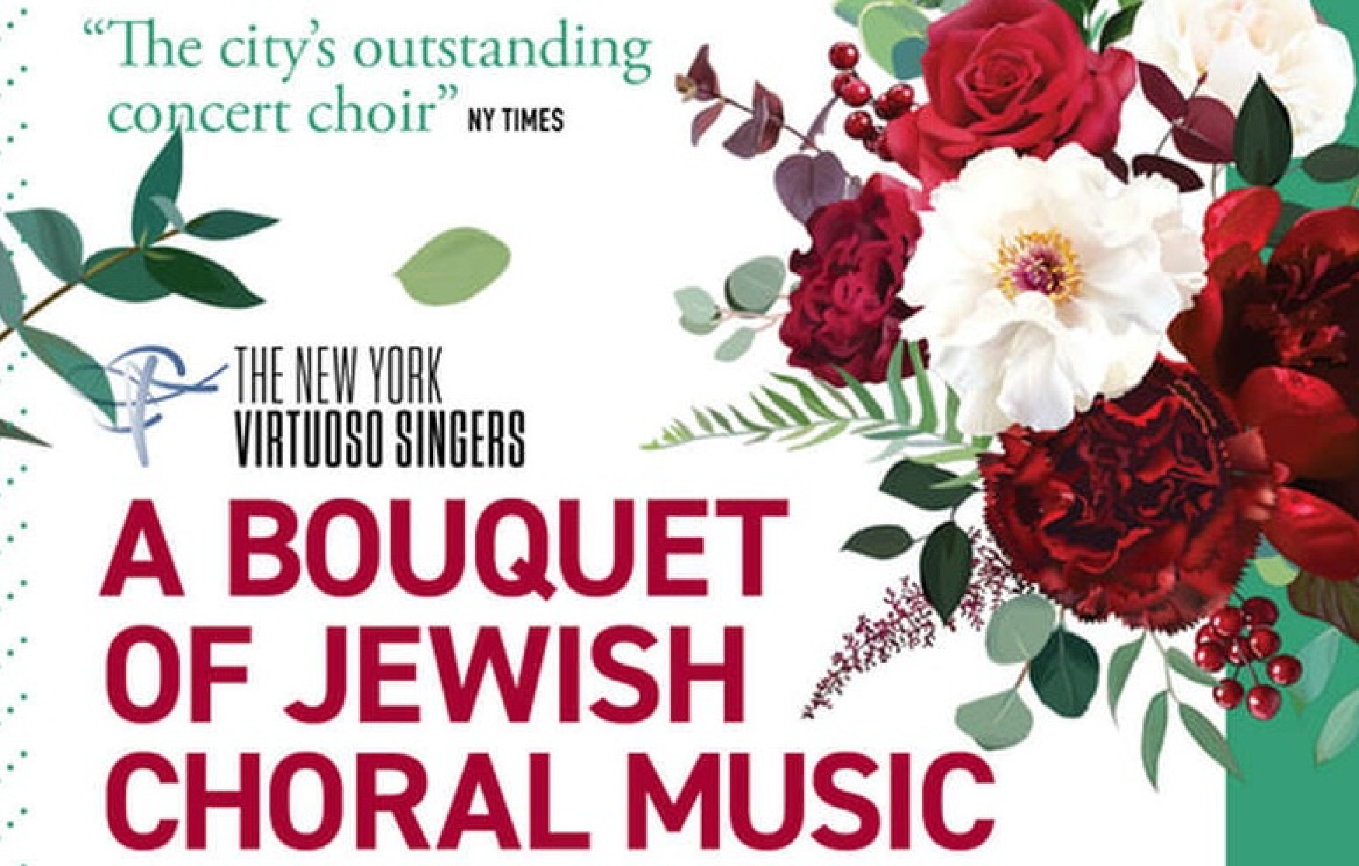 Join us for a bouquet of Jewish choral music performed by the acclaimed New York Virtuoso Singers, under the direction of its award-winning conductor Harold Rosenbaum. The program includes music by Pulitzer Prize-winning composers Yehudi Wyner, Aaron Jay Kernis, Shulamit Ran, and Ellen Taaffe Zwilich, as well as new and exciting Jewish music by Samuel Adler, Gerald Cohen, Alex Guerrero, Leon Hyman, Natasha Hirschhorn, Joel Mandelbaum, and Alex Weiser.