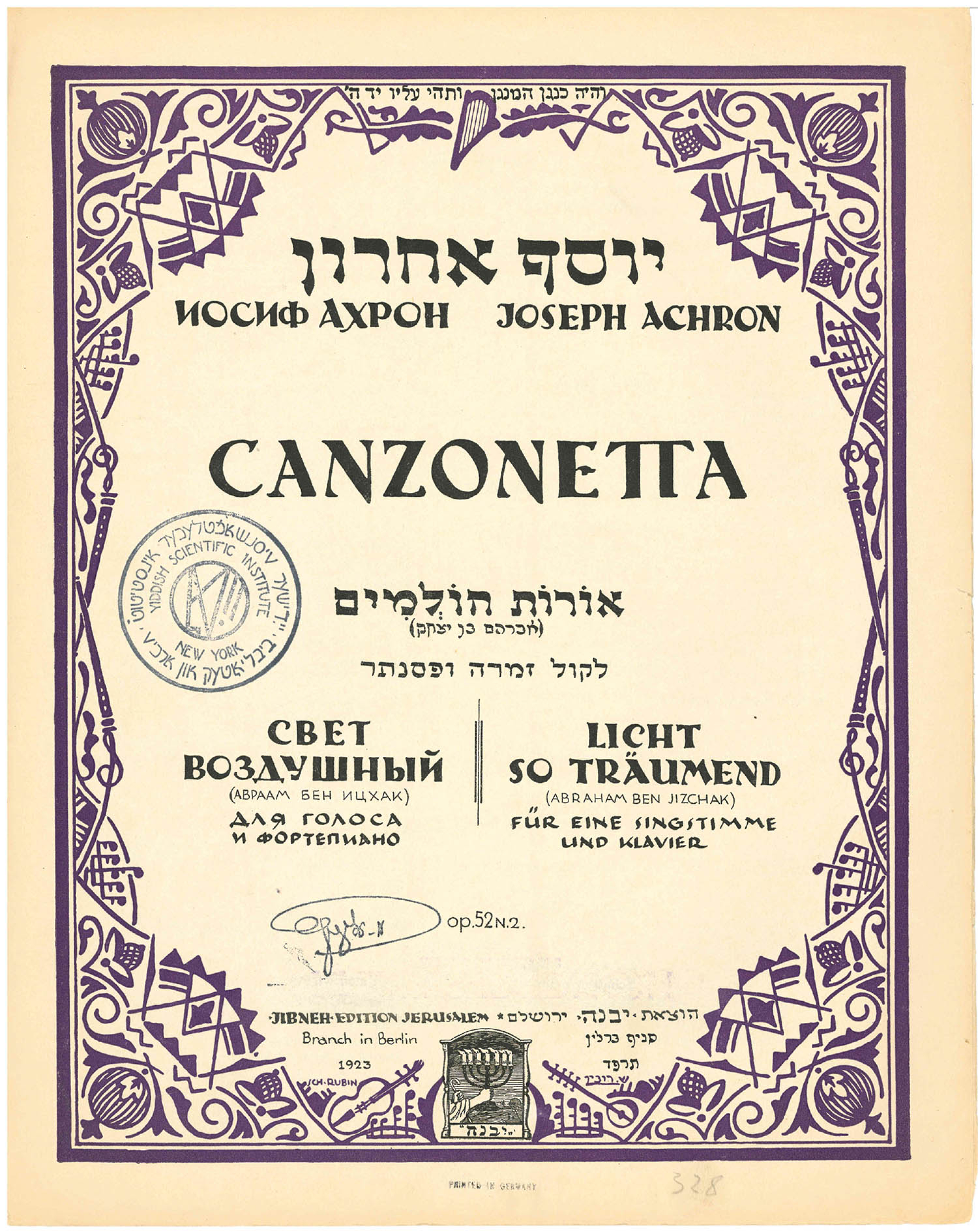 The Weimar Republic era contained a hotbed of Jewish musical activity. Following World War I, there was a spike of curiosity about Eastern European Jewry and Yiddish, which inspired many German-Jewish composers—from Cantor Leon Kornitzer to avant garde composer Stefan Wolpe—to explore Yiddish folksong in their music. At the same time, Berlin and Vienna acted as important publishing centers for the Jibneh Edition. In addition to featuring music of some German-Jewish composers such as Aron M. Rothmüller and Israel Brandmann, Jibneh Edition disseminated music of composers born in the Russian Empire associated with the Society for Jewish Folk Music such as Joel Engel, Joseph Achron, Michael Gnessin, and Alexander Krein, as well as the great Yiddish song composer Lazar Weiner writing in America. This rich musical activity bridged communities active in the East and West and reflected the linguistically and ideologically diverse aspirations of Jewish composers of its time. Join YIVO for a concert exploring Yiddish and Hebrew songs of the Weimar Republic.