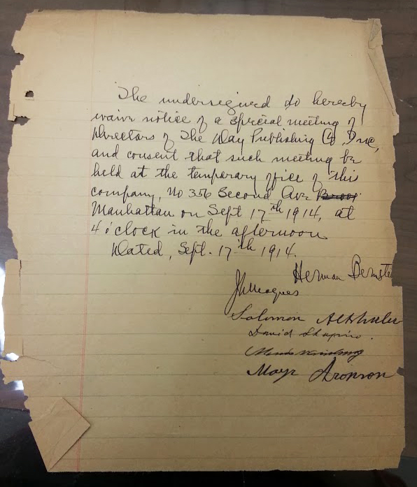Document signed by Herman Bernstein and other founders of Der Tog, a few months before the first issue of the newspaper
