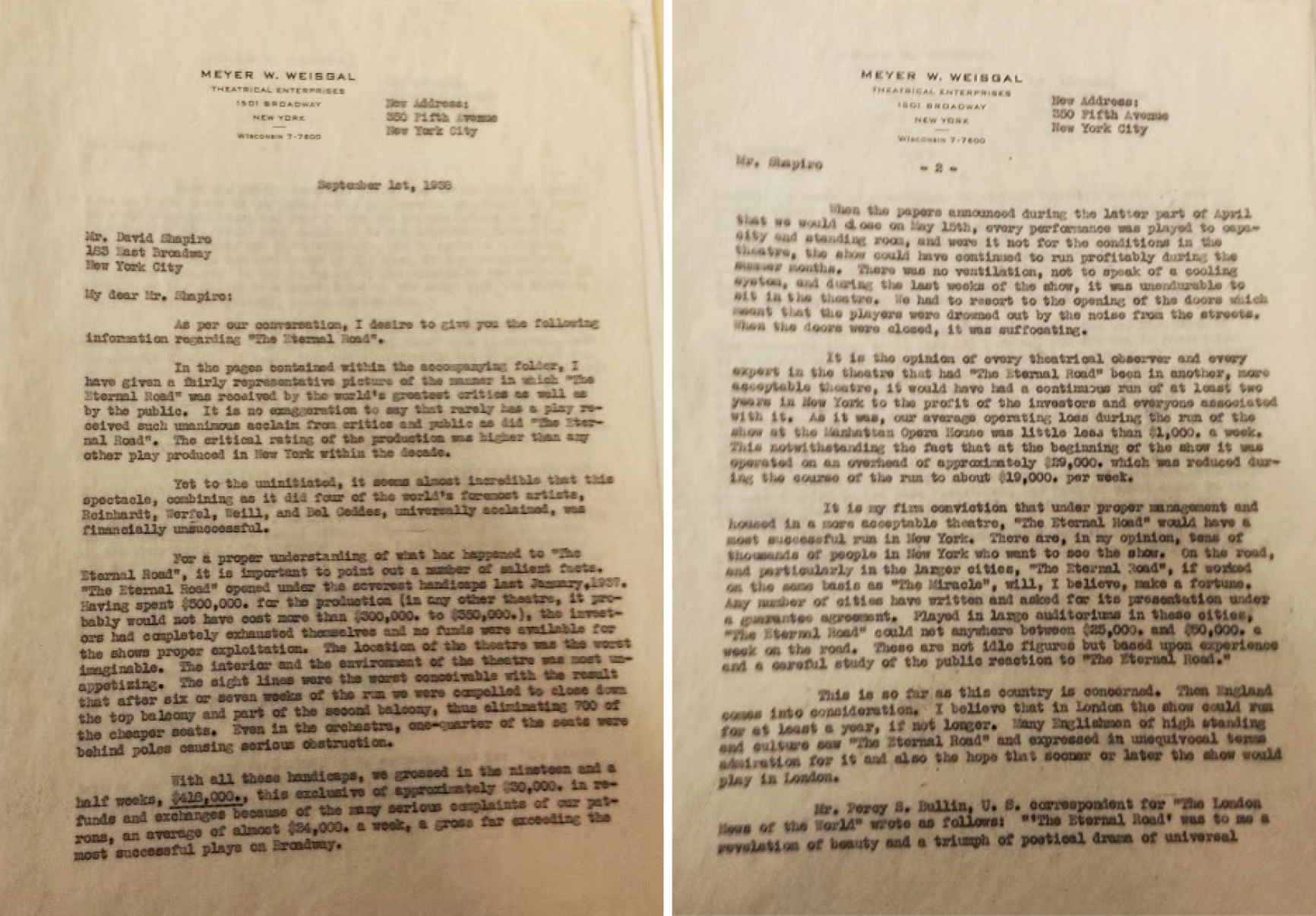 First and second pages of a report by Meyer Weisgal, impresario for The Eternal Road, attempting to justify financial losses incurred by the production